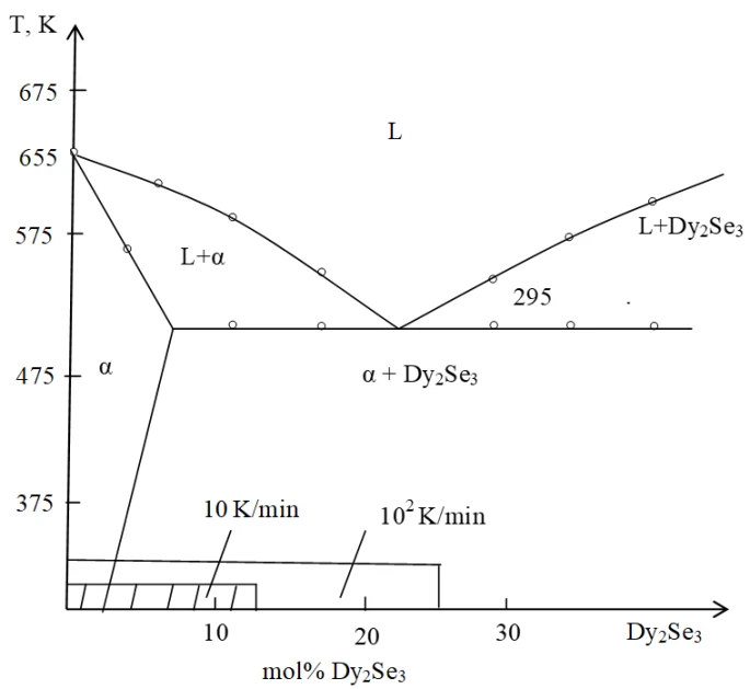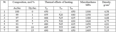 The homogeneity region based on As2Se3 extends to 2 mol.% DySe at room temperature. It was established that upon cooling at a rate of 10 K/min and 102 K/min the glass-forming region in the system expands to 10 and 20 mol. % DySe, respectively. Complete crystallization of glassy alloys was confirmed by microstructural analysis and X-ray diffraction. As evident from the phase diagram, an increase in DySe content leads to a corresponding enhancement of macroscopic properties (table 2).