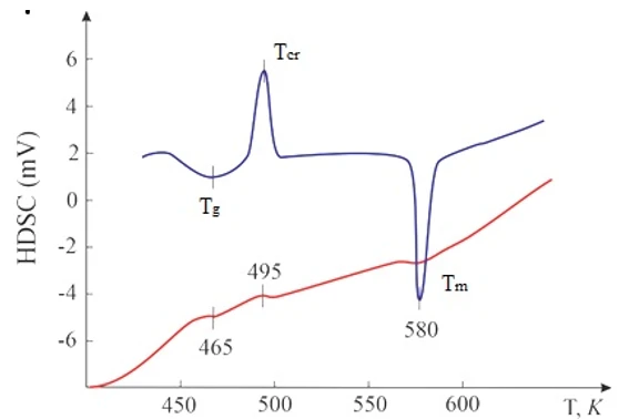Tg - glass formation temperature, Tcr- crystallization temperature, Tm- melting temperature.