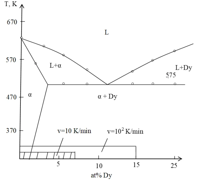 The synthesized alloys were characterized using a combination of physicochemical analysis techniques. Differential thermal analysis (DTA) was conducted using Kurnakov pyrometer and a Termoskan-2 instrument. DTA measurements were performed up to 1000 K using a chromel-alumel thermocouple.