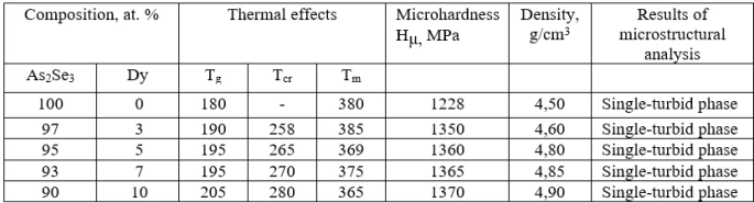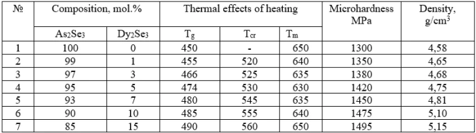 The homogeneity region based on As2Se3 reaches to 2.3 mol.% Dy2Se3 at room temperature. Table 3 shows the results of the physicochemical analysis of the alloys of the As2Se3-Dy2Se3 system.